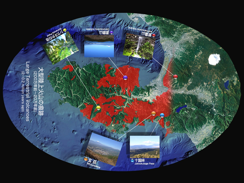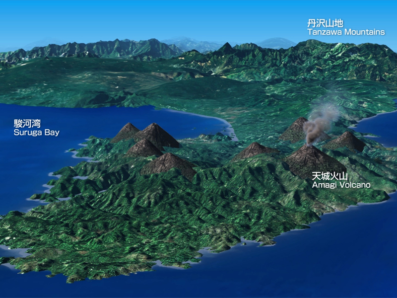 NHKの番組「ブラタモリ」前編「伊豆」(放送5/12・再5/23)後編「伊豆・天城超え」(放送5/19・再5/29)の二回に亘って、 弊社が作成したコンピューターグラフィックス(CG)「伊豆の成り立ち」の一部が放送されました。 このCGは、静岡県伊豆市修善寺にある「伊豆半島ジオパークミュージアム「ジオリア」で上映されている映像の一部です。遥か南の海底にあった海底火山が、 プレートテクトニクスにより移動し、さまざまな火山活動を経て、本州と衝突、現在の伊豆半島ができるまでをCG再現したものです。
