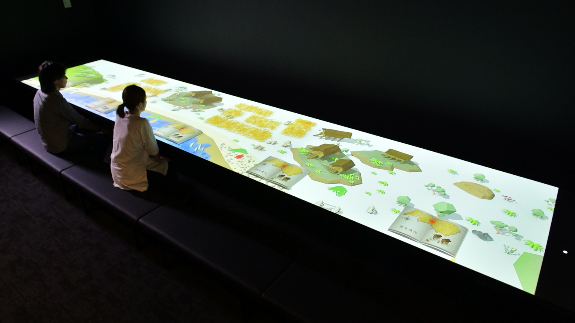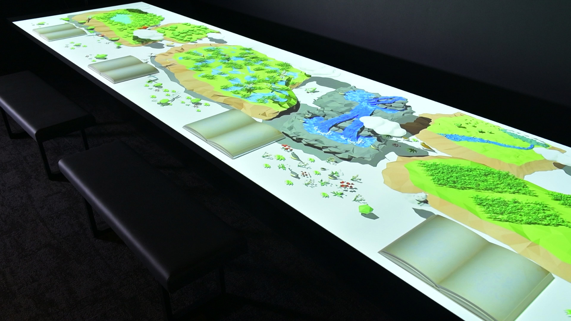 横6m×奥行き1.2mの巨大テーブルマッピング。デザイン性の高い3DCGによるファンタジックな世界を構築。視聴する位置を変えることで多様なアニメーション演出を何度も楽しめるコンテンツ。