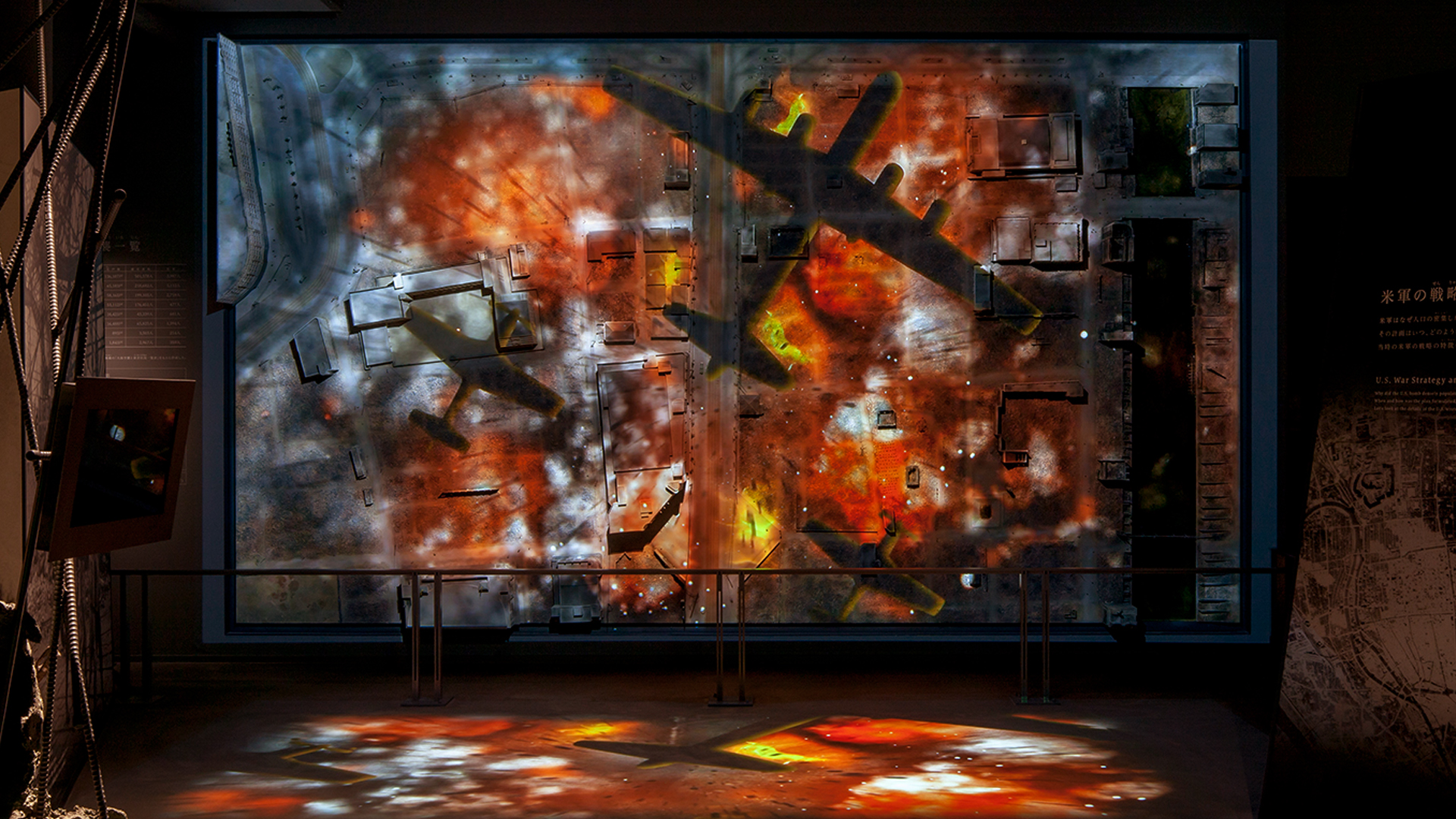 大阪大空襲によって焼け野原となった大阪市街の巨大模型(4m×3m・壁掛け)にプロジェクションマッピングを投影。迫力のある音声演出と合わせて体験する映像コンテンツ。