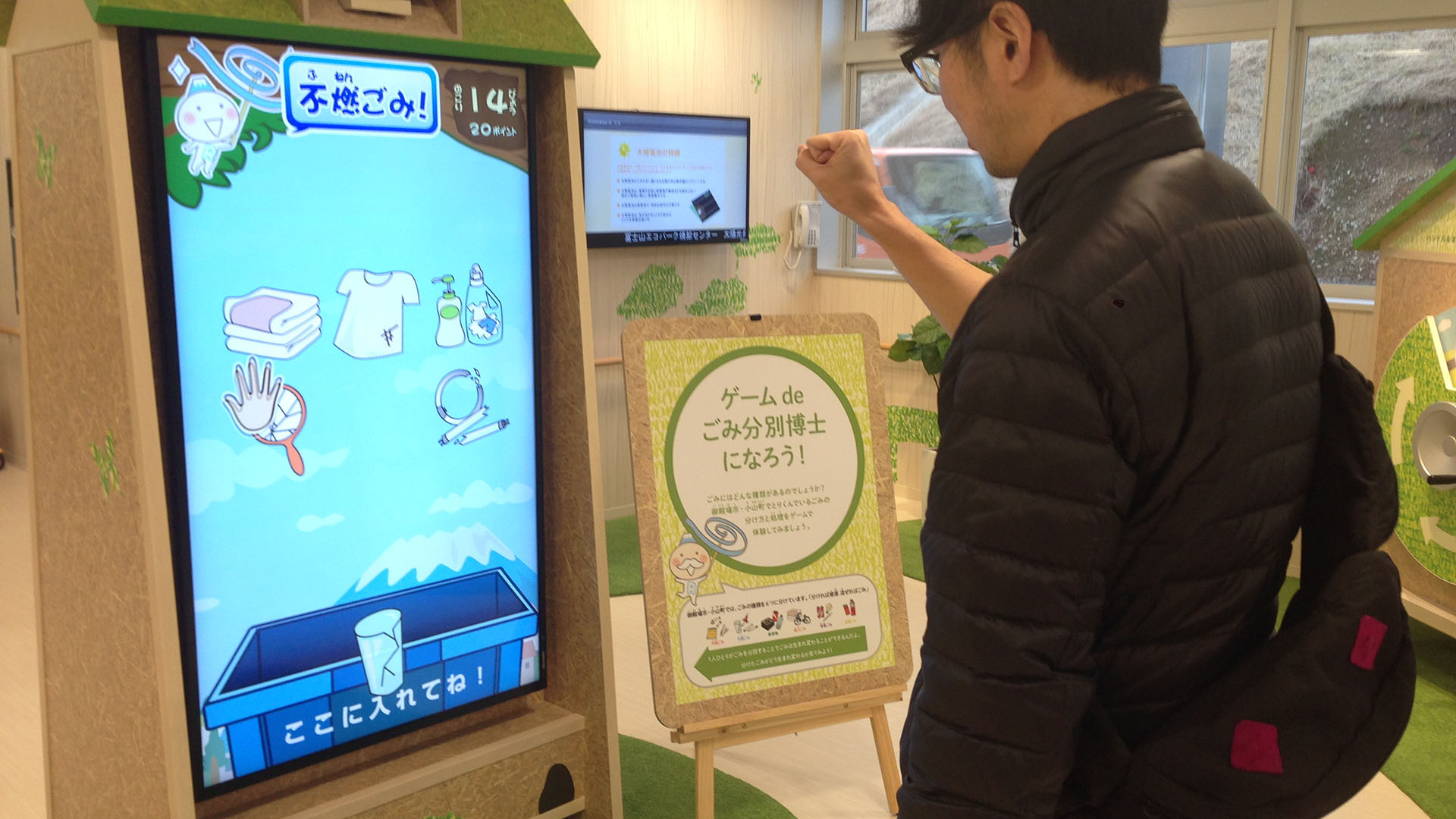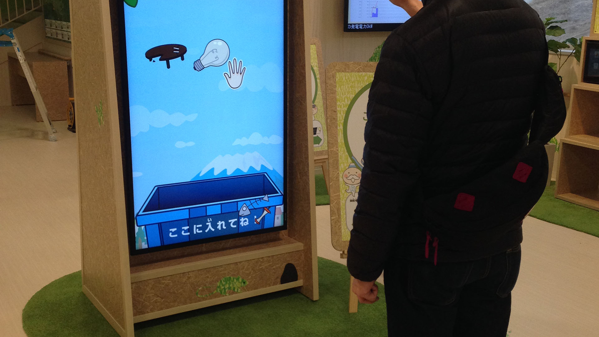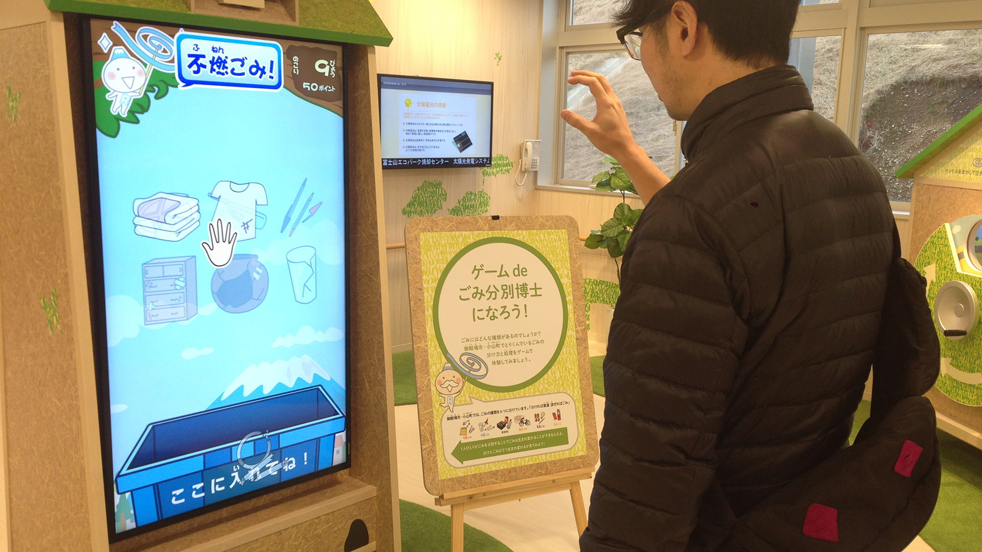 ごみの分別について学べるゲームコンテンツを制作。体の動きを読み取るKinect(キネクト)を使い、実際に手でごみを掴んで分別することの出来る、体感型ゲームです。館内の設備をタッチパネルで検索するPCソフトも制作。