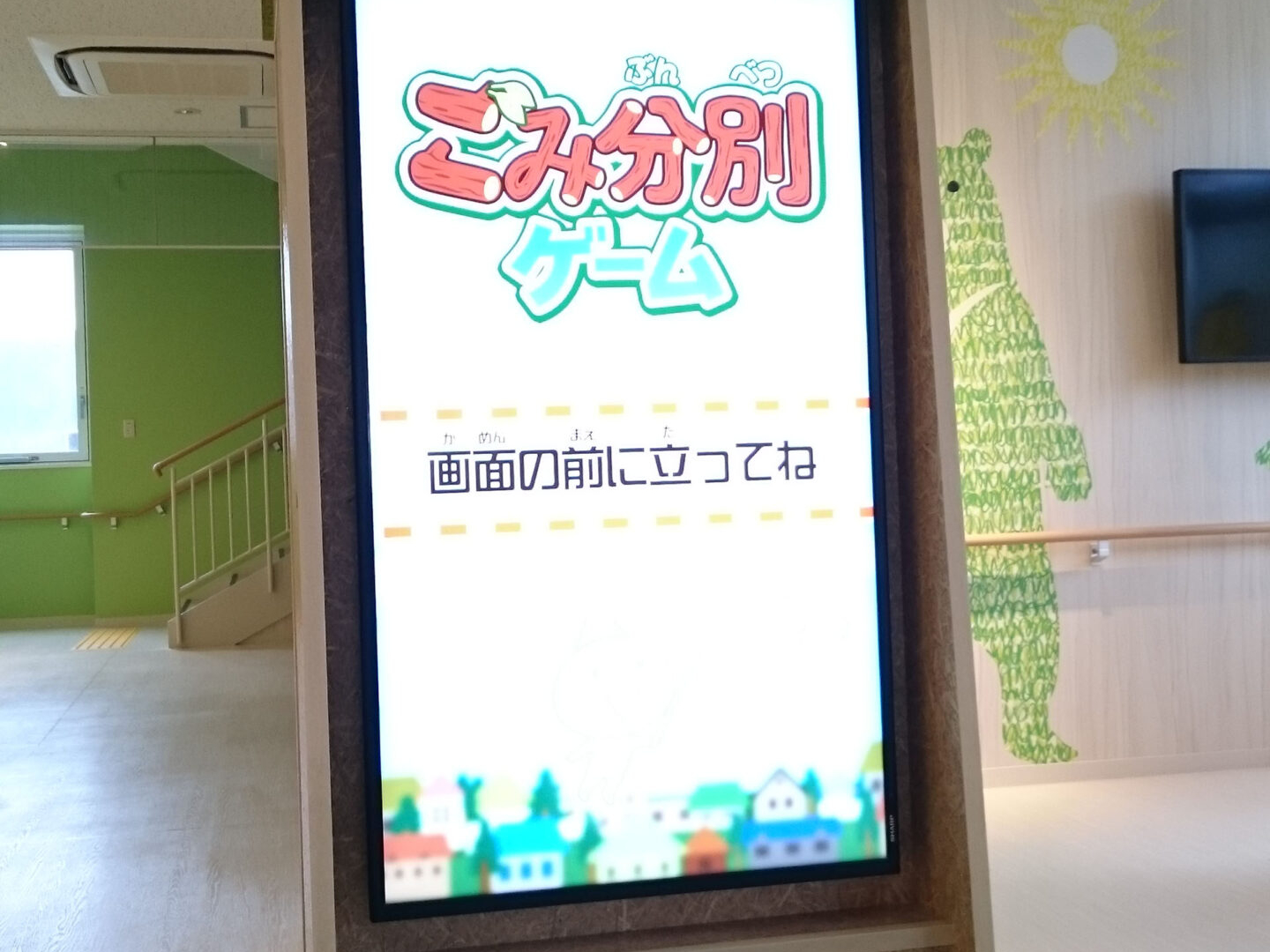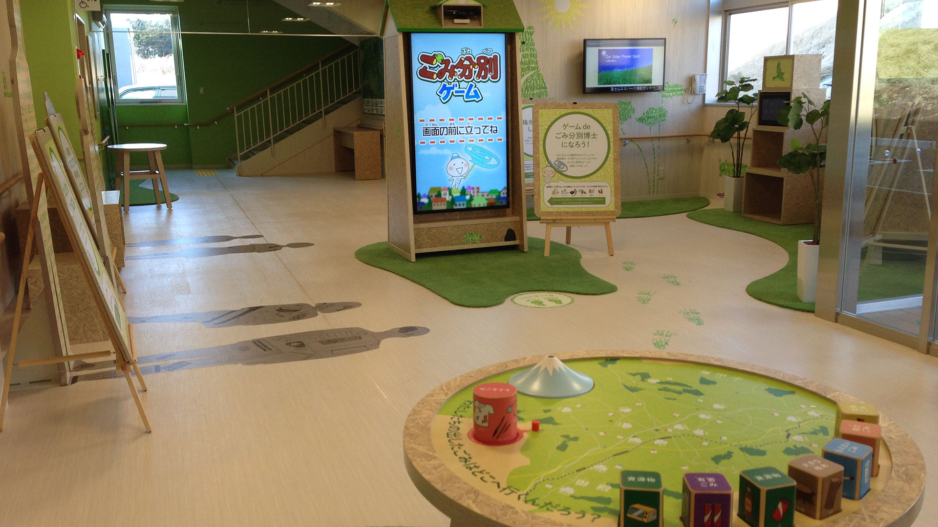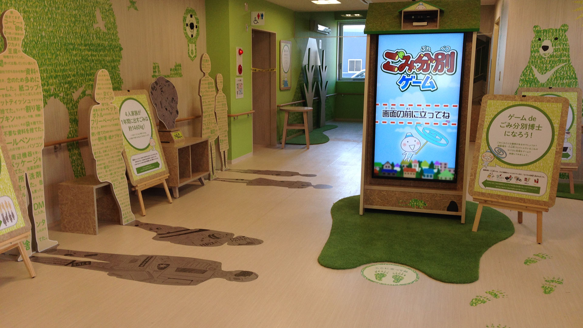 ごみの分別について学べるゲームコンテンツを制作。体の動きを読み取るKinect(キネクト)を使い、実際に手でごみを掴んで分別することの出来る、体感型ゲームです。館内の設備をタッチパネルで検索するPCソフトも制作。