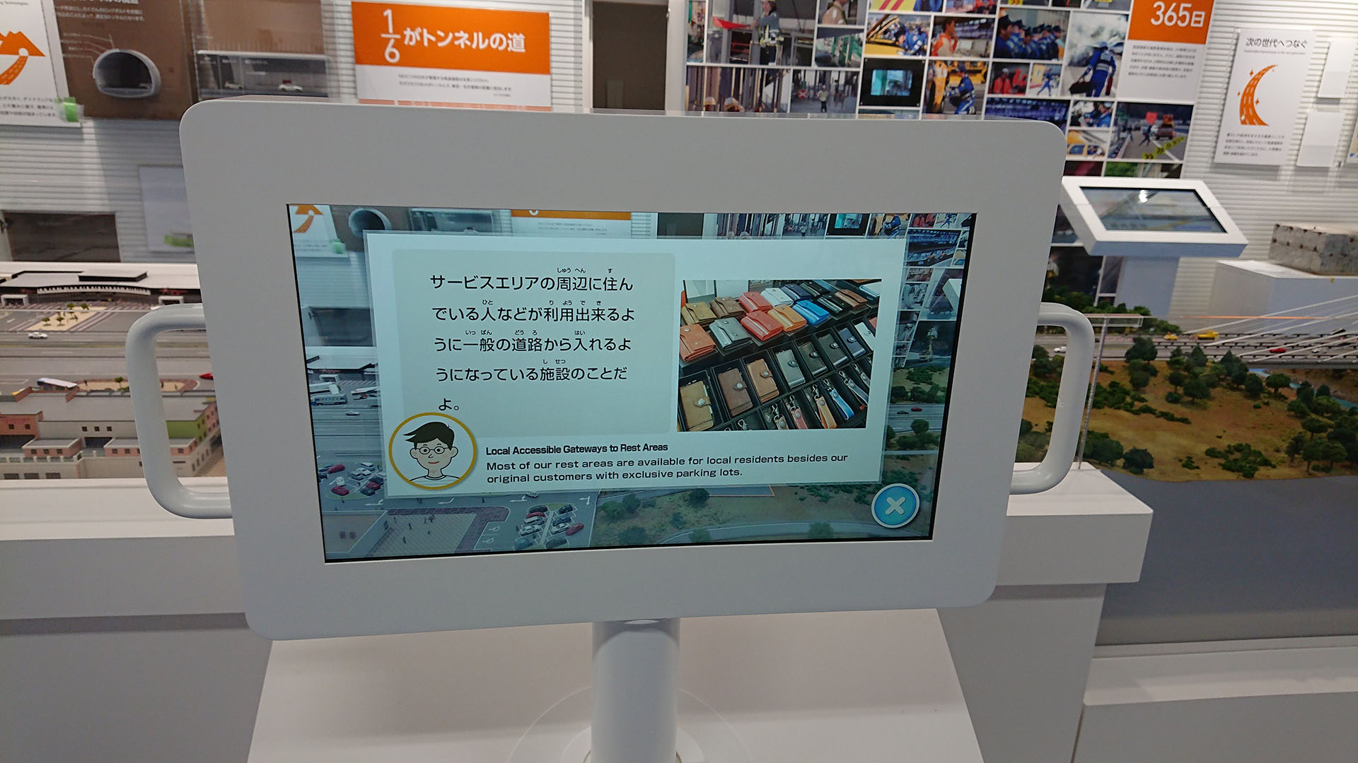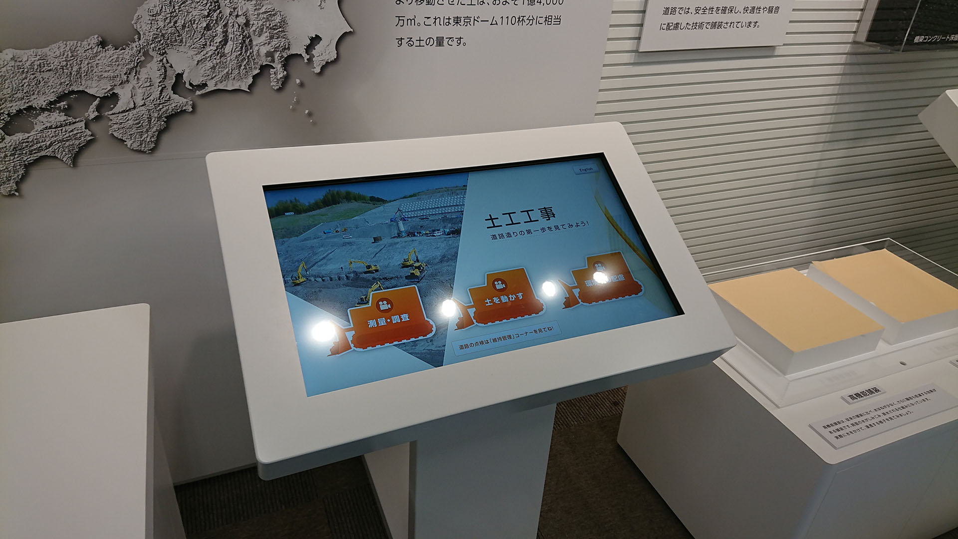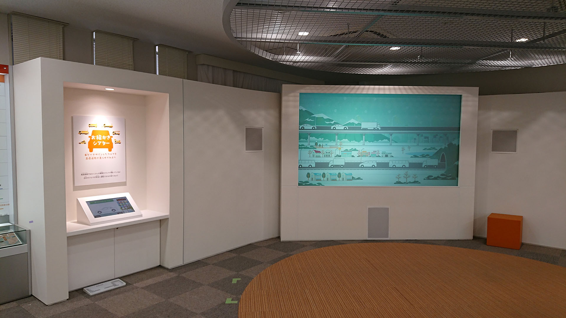 中日本地域の高速道路を管理するNEXCO中日本。高速道路のジオラマ上にイラストを表示して解説するARコンテンツ、自分でデザインした車が大スクリーンを走行するお絵描きシアター、高速道路の仕組みや業務内容を映像でわかりやすく紹介する情報端末などコンテンツを制作。子どもにも高速道路に興味・関心を持ってもらうために、高速道路で働く車など、面白いポイントをフィーチャーし、楽しい雰囲気を大切に制作。