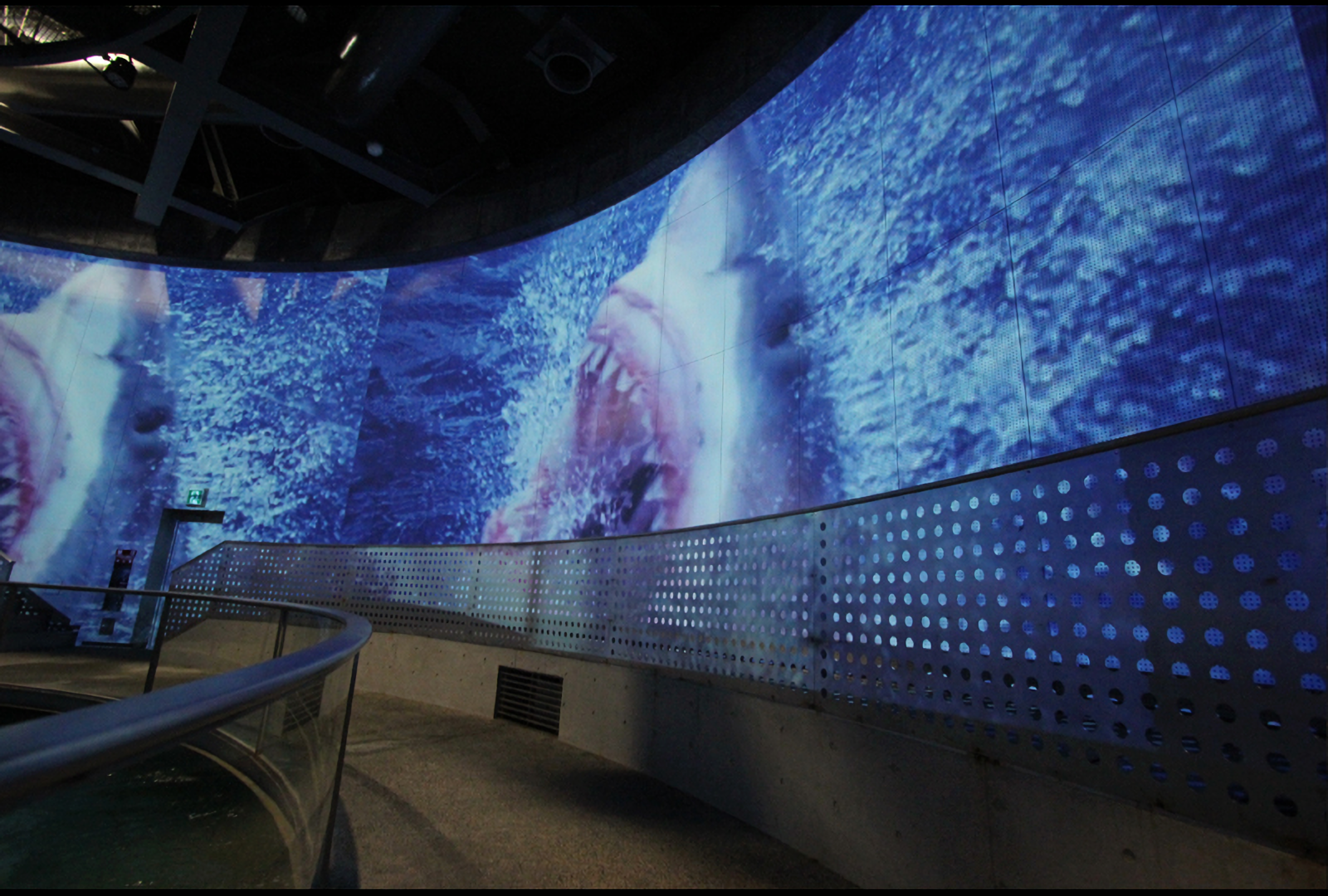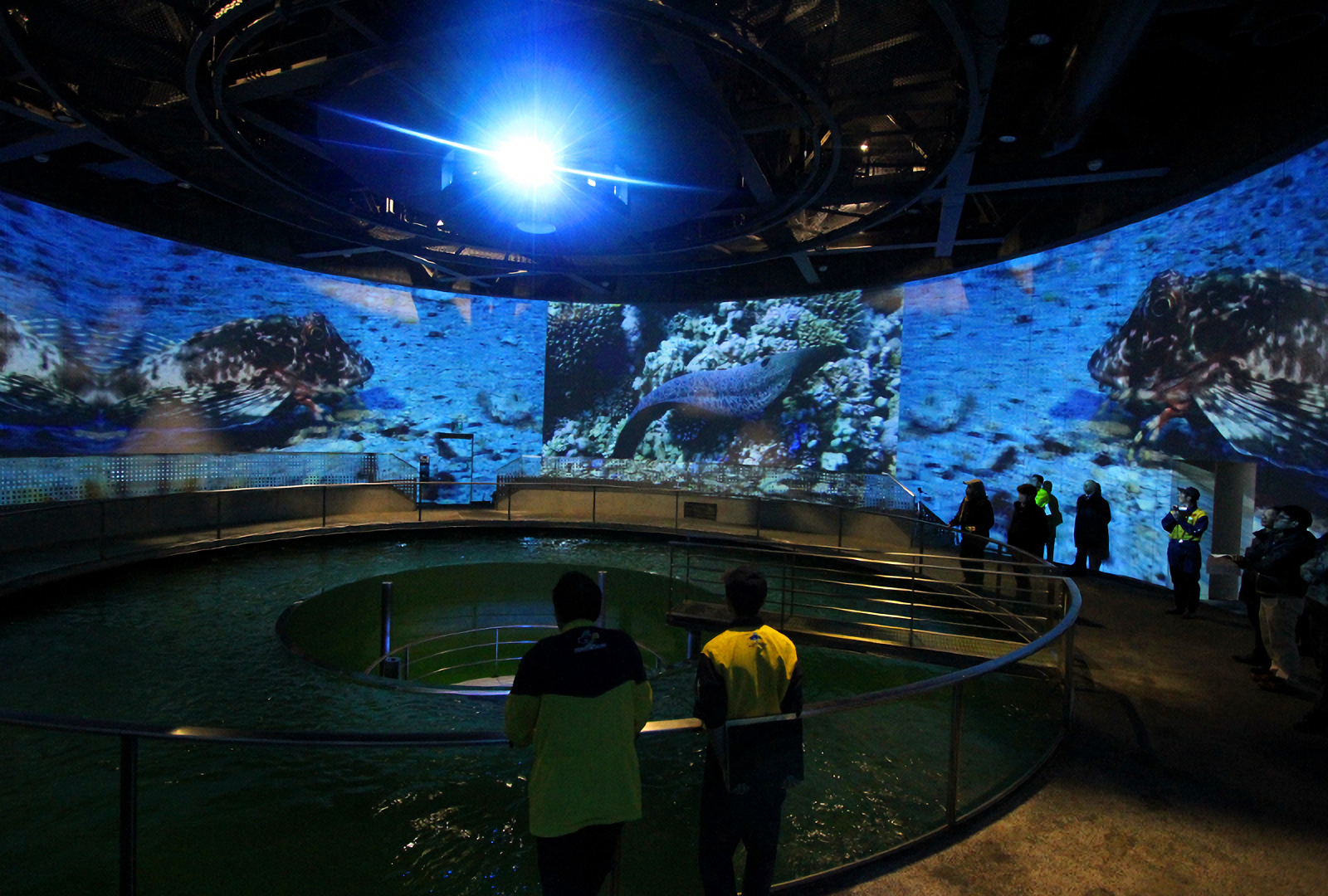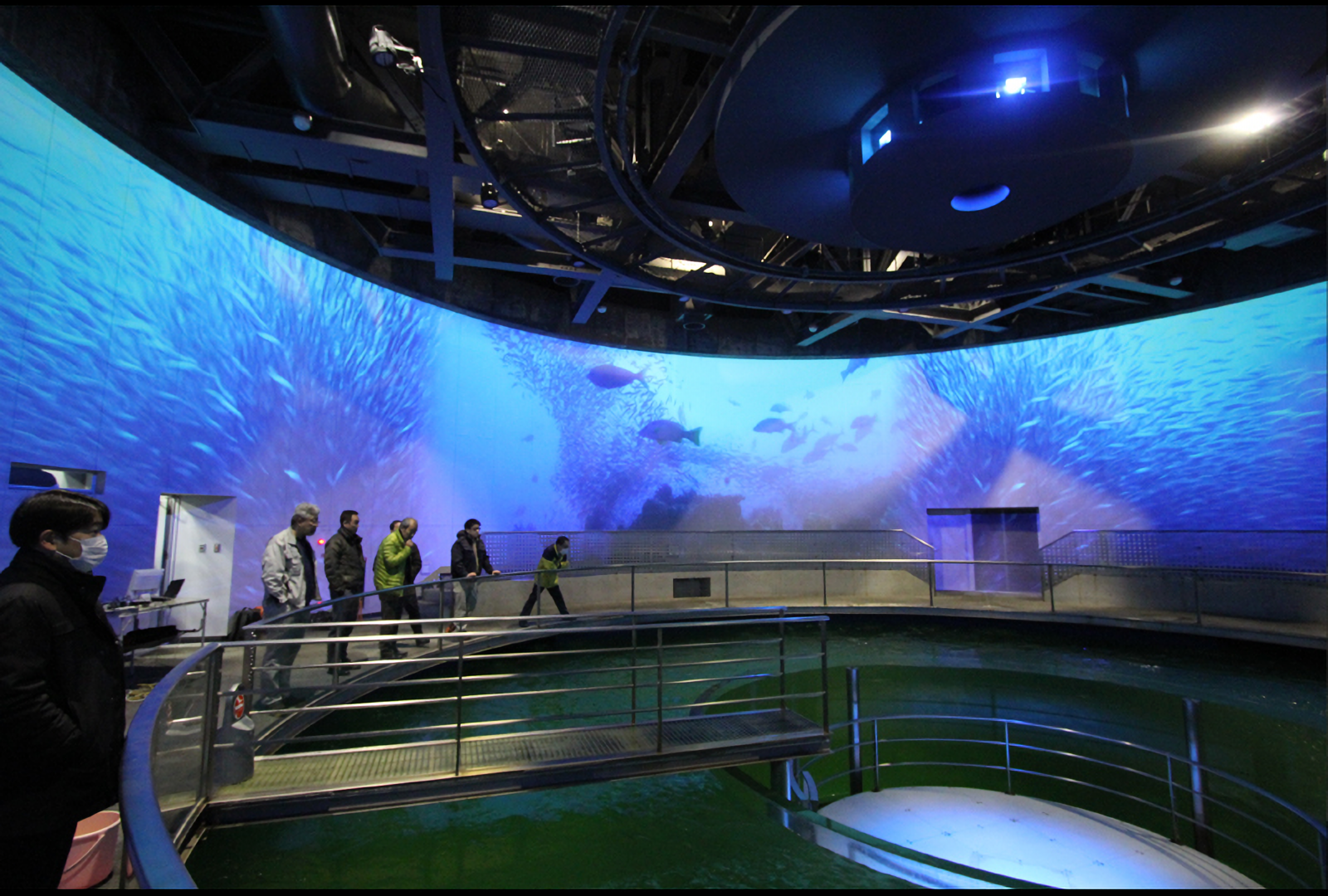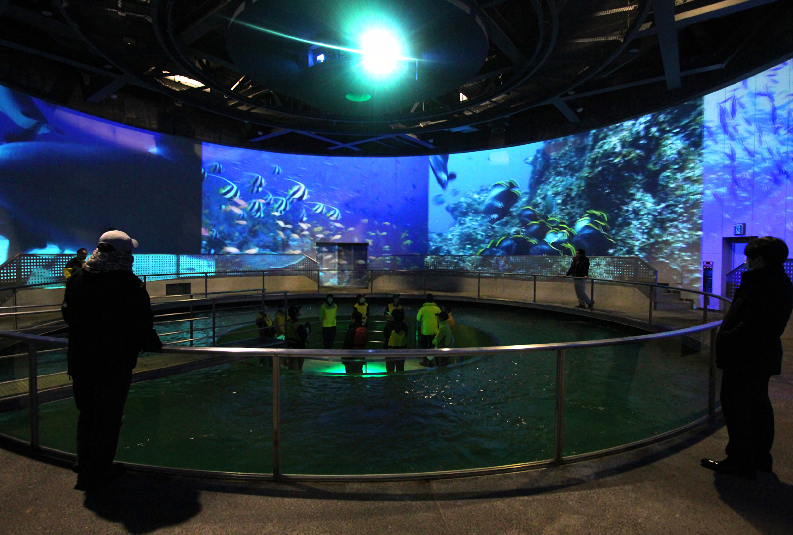 円筒型360度シアター(500インチラ6面)フィッシュダンス」をテーマに、実写映像とCGを使い、魚たちの変わった泳ぎ方や求愛行動などを紹介。フロートの浮き沈みで海中の臨場感を演出。
